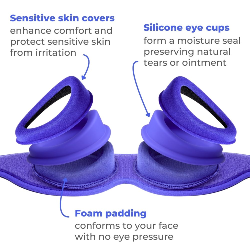 Proprietary silicone eye cover design forms a moisture seal around your eyes, hydrating dry eyes and preserving tears or ointment throughout the night.